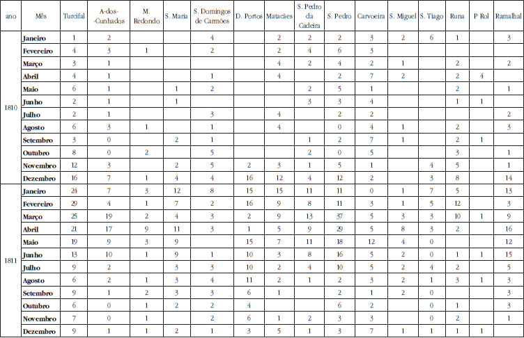 [172] Alguns exemplos: Maxial, Baptismos, B1, fl. 194v, S. Maria do Castelo Óbitos, livro O3, fls.83v-84. S. Tiago, Baptismos, livro B6, fl. 1v, Carvoeira, Óbitos, livro O5, fl. 2.