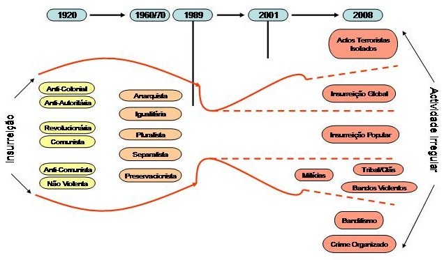 Um modelo possível de categorização dos diferentes tipos de insurreição a partir dos anos vinte do último século, incluindo uma possível classificação contemporânea, pode ser encontrado no Manual de Campanha de Contra-Insurreição do Exército Britânico2 (figura 1).