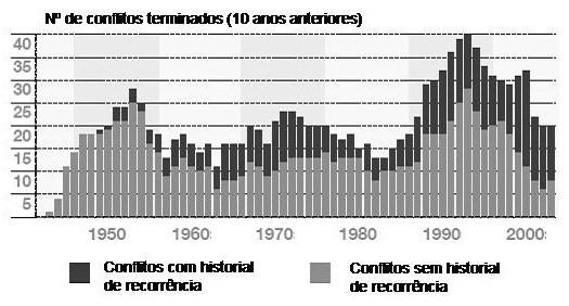 O gráfico apresentado na figura 6 mostra o aumento de conflitos recorrentes ocorrido nos últimos anos. Para cada ano, a barra indica o número de conflitos terminados nos dez anos anteriores. O tom mais escuro da parte superior da barra indica o número de conflitos que, tendo terminado nos dez anos anteriores, possuíam um historial de recorrência.