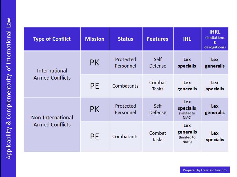 Consequently, in international conflicts, IHRL is binding upon military PK19 personnel, as lex generalis, according to the extraterritorial jurisdiction regime, in their relation with individuals taking no active part in the hostilities and in their effective control. Likewise, IHL is also binding upon military PK personnel, as lex specialis, in line with their State treaty law20 and in their relation with the opposing forces, every time that armed force is used in self-defense. Besides, in these type of conflicts, IHL binds PE personnel as lex generalis and in their “armed relation” with the opposing forces (combat actions), and IHRL is binding as lex specialis in their relation with individuals taking no active part in the hostilities and in their effective control. Furthermore, in non-international armed conflicts, the applicable provisions of the sending State treaty law IHL21 applies to PE forces as lex generalis and IHRL22 provisions in force within the jurisdiction of the sending State are also binding as lex specialis23, every time they act as public authority and not as combatants. Likewise, IHL binds PK forces as lex specialis and IHRL as lex generalis24;