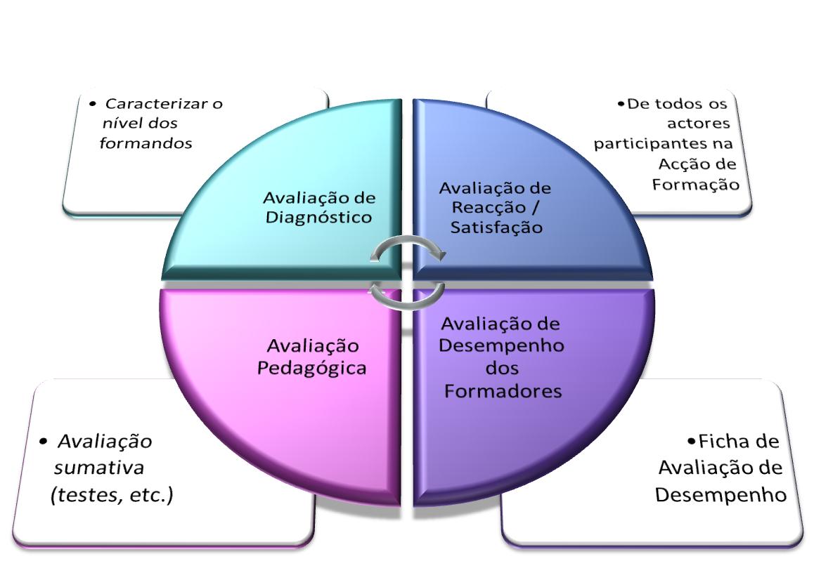O documento V - Perfil de Avaliação, terá como finalidade avaliar o impacto da acção de formação no formando, o seu desempenho no Posto de Trabalho e os resultados obtidos pela organização. O Perfil de Avaliação divide-se em duas componentes: a avaliação interna e a avaliação externa. Nas figuras 6 e 7 caracterizamos cada uma delas, identificando os seus tipos e qual a sua finalidade.