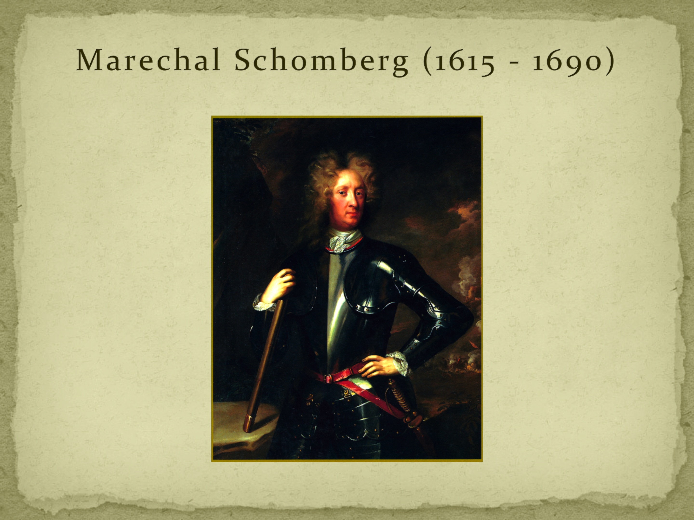 Considerado, segundo o seu biógrafo sul-africano Prof. Matthiew Glozier, “o mais hábil soldado do seu tempo”, Frederick Herman von Schomberg, de família nobre e influente, nasceu em Heidelberg, no Principado do Palatinado (Alemanha), em 6 de Dezembro de 1615, e após ter servido continuamente, durante 57 anos, nos exércitos do seu país, da França, da Suécia, da Inglaterra, de Portugal, da Holanda e do Reino de Bradenburgo, morreu em combate na Batalha de Boyne Water, na Irlanda, então ao serviço da Inglaterra, em 1 de Julho de 1690, portanto com 75 anos. No seu tempo de serviço, em mudança permanente, foi simplesmente combatente, comandante, conselheiro militar e político e, no campo religioso e social, acérrimo defensor do protestantismo (huguenottes), ganhando honras, títulos nobiliárquicos e dinheiro, tornando-se durante a vida proprietário de extensos e valiosos bens tanto na França, segundo país de adopção, como na Alemanha.