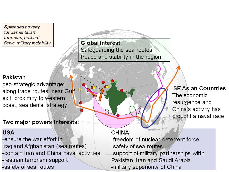 Pakistan has a geo-strategic benefit concerning its position along the trade routes off the Hormuz Strait, its proximity to the Gulf, the proximity of the Indian western coast and its sea denial maritime strategy based on a relevant submarine fleet.