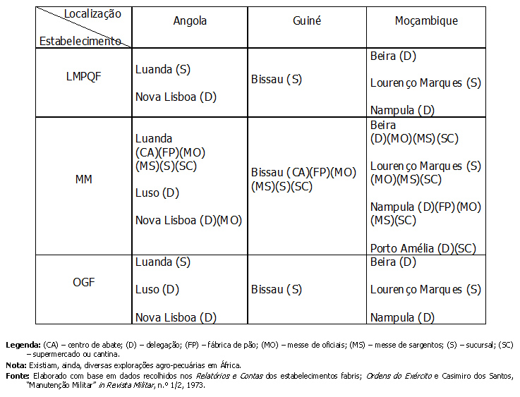 Num outro plano, na metrópole, o contributo dado pelos Estabelecimentos Fabris do Ministério do Exército (EFME) foi decisivo para a sustentação do esforço de guerra no ultramar pela relativa autonomia face ao estrangeiro que foram capazes de assegurar, concretamente no que diz respeito à produção de grande parte das munições e armamento ligeiro utilizados, equipamento pessoal, medicamentos, víveres e à reparação e manutenção de meios. Os EFME ajudaram também a financiar as despesas militares, colmatando insuficiências financeiras pontuais e ocultando os verdadeiros custos da guerra.