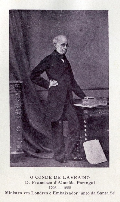 [12] cf. D. Francisco de Almeida Portugal, 2º. Conde de Lavradio (decreto de 1-12-1834), Par do Reino (carta régia de 1-10-1835), Ministro dos Negócios Estrangeiros (de 1-8-1826 a 9-6-1827 e de 26-5-1846 a 6-10-1846), Conselheiro de Estado Honorário (a 28-8-1826), Veador da Infanta D. Isabel Maria, Grã-Cruz da Ordem de Cristo, Torre-e-Espada, Leopoldo da Bélgica, de Ernesto Pio de Saxe, Guelfos de Hanôver, do Danebrog da Dinamarca, Comendador da Ordem de N. Sra. da Conceição de Vila Viçosa, condecorado com a Ordem de Hohenzollern de 1ª. classe, Ministro Plenipotenciário em Londres (por decreto de 30-7-1851 a 1869) e em Roma (1869-1870), Conselheiro de Embaixada em Madrid (1818) e em Paris (1819-1821), Presidente da Câmara dos Pares (de 7-12-1857 a 1-2-1870), Sócio da Academia Real das Ciências, etc. Começou a carreira diplomática em 1818, ano em que foi nomeado conselheiro de embaixada em Madrid, e no ano seguinte, em 1819 foi transferido para o mesmo cargo em Paris, lugar que exerceu até acabarem os conselheiros de embaixada em 1821. Nesse ano foi nomeado pelo governo liberal, que se estabelecera no país, encarregado de negócios em Viena de Áustria, mas como o príncipe de Metternich não quis reconhecer os governos saídos da revolução, este não pode partir para o seu destino e recebeu ordem de ficar em Paris. Outorgada a Carta Constitucional em 1826 e organizado o governo segundo os novos princípios, foi chamado ao ministério pela Infanta Regente D. Isabel Maria, em 1 de Agosto desse ano, sendo nomeado Conselheiro de Estado no dia 28 deste mês. No dia 6 de Dezembro seguinte pediu a demissão, mas quatro dias depois tornou a ser chamado pela regente para o elenco governamental. Como ministro dos Negócios Estrangeiros teve logo de protestar contra o procedimento do governo espanhol, que protegia abertamente os revolucionários absolutistas e como a protecção continuasse, viu-se obrigado a pedir socorro à Inglaterra, que prontamente nos enviou uma divisão comandada pelo general Clinton. Visto a situação ser insustentável, a rainha D. Carlota Joaquina e as cortes intrigavam, havia dissidências entre os ministros, e D. Francisco de Almeida Portugal viu-se obrigado a pedir definitivamente a sua demissão em 6-6-1827. Após o golpe de Estado de D. Miguel I, protestando contra esse acto, resolveu emigrar imediatamente, indo para França, onde o partido da regência o nomeou ministro, e naquela qualidade apresentou as suas credenciais a Carlos X, a 25-4-1830, e a Luís Filipe, Rei dos Franceses, a 19 de Setembro do mesmo ano. Teve encargos importantíssimos, como o de velar pela rainha D. Maria II, durante a sua residência em Paris, onde esteve completando a sua educação, cargo tão honroso como cheio de responsabilidades; o de auxiliar o duque de Bragança, D. Pedro IV, na organização da expedição libertadora, e foi ainda ele quem tratou com o maior zelo de favorecer no estrangeiro a causa da liberdade, que então se via em extremos apuros, achando-se o exército de D. Pedro bloqueado no Porto, e sem esperanças de ver terminada aquela dolorosa situação. Foi Encarregado de Negócios em Madrid, a 4-4-1835, mas logo a 23 de Maio partiu para Londres para tratar de difíceis negociações. A 11-12-1835, foi ele o escolhido para ir à Corte de Saxe Coburgo, para ajustar o casamento de D. Maria II com D. Fernando, após a morte prematura de D. Augusto de Leuchtemberg, primeiro marido daquela soberana. Assim, com plenos poderes da Rainha, assinou em seu nome, o contrato nupcial de casamento por procuração, em 1-12-1835, e acompanhou a Lisboa o novo Príncipe Consorte, voltando depois a exercer as funções de Ministro de Portugal em Madrid. Em 1851 era nomeado Ministro em Londres, onde se conservou dezoito anos, dando a plena medida das suas grandes capacidades diplomáticas e da sua grande influência junto dos governos britânicos. Lord Palmerston, tinha por ele e pelas suas opiniões a maior consideração, sendo um dos diplomatas estrangeiros que mais atendia. Conquistou a simpatia e até a amizade da Rainha Vitória de Inglaterra e do Príncipe Alberto, sendo recebido por estes com uma intimidade, como a poucos foi concedida. Devido às suas ideias liberais, foi chamado pela rainha D. Maria II ao poder, no ministério que se organizou em 26-5-1846, encarregando-se da pasta dos Negócios Estrangeiros. Este ministério durou apenas até ao golpe de Estado de 6 de Outubro do mesmo ano, e o 2º. Conde do Lavradio foi para a câmara dos pares, fazendo enérgica oposição ao governo. Em 1857, foi acreditado junto do Rei da Prússia, Frederico Guilherme IV, para negociar o casamento de El-Rei D. Pedro V com a Princesa Estefânia de Hohenzollern-Sigmaringen. O tratado de casamento foi assinado em 8-12-1857, tendo sido plenipotenciário o Conde de Lavradio, por parte de Portugal, e Luiz de Massow, por parte da Prússia. A 29-4-1858 realizou-se a cerimónia nupcial em Berlim, sendo o noivo representado pelo Príncipe Leopoldo de Hohenzollern-Sigmaringen, que acompanhou a irmã D. Estefânia a Portugal, casando-se, mais tarde, com a Infanta D. Antónia, irmã de D. Pedro V. Em 7-2/3-1869, foi transferido para Roma, mas por pouco tempo naquela legação, porque a morte surpreendeu-o, contando setenta e três anos de idade e mais de cinquenta de vida diplomática, * em Lisboa, Santa Engrácia, a 12-7-1797, † Roma 1-2-1870. Casou 1ª. vez em Alcântara, Lisboa, a 6 ou 10-7-1840, com D. Joaquina José de Mello (* em Alcântara, Lisboa, a 23-1-1817, †Londres a 22-12-1858), Dama da Ordem de S ta. Isabel, filha dos 9os. Condes de S. Lourenço, sem geração. Casou 2ª. vez a 10-2-1866 com D. Maria Rita Tenório y Moscoso (* a 23-7-1836), filha de D. Pedro Carlos Tenório y Moscoso e D. Maria da Luz Miranda e Silva, sem geração.
