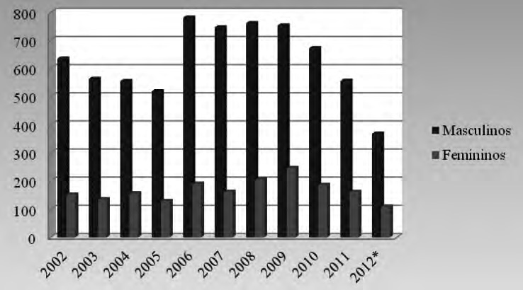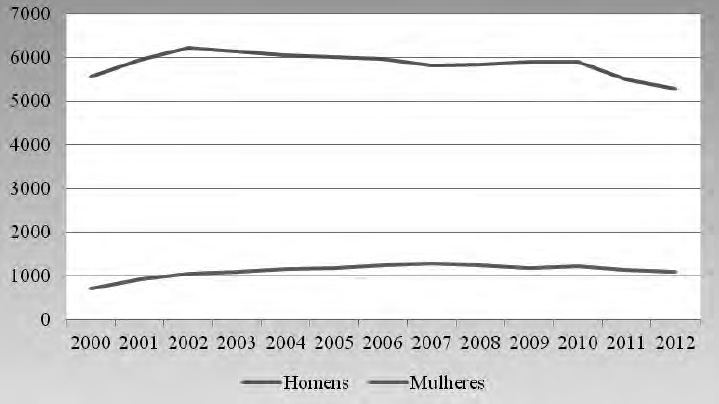 No que respeita ao número de mulheres no efetivo global, verifica-se a seguinte distribuição, desde 2000 até 2012 (Gráfico 2).