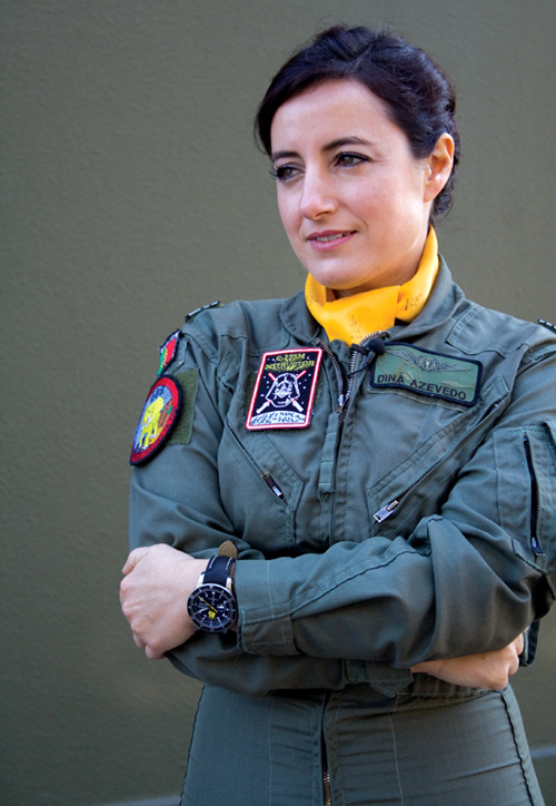 A primeira experiência de voo foi também marcante para a Tenente-Coronel Piloto Aviador Diná Azevedo (Figura 6) que, apesar dos vinte e dois anos volvidos, a recorda com emoção e como “determinante para a decisão na escolha desta carreira.” O seu diversificado e assaz operacional currículo é prova bastante da sua dedicação à profissão e vocação que abraçou: qualificou-se em diversas aeronaves, foi piloto instrutor de Chipmunk, foi a primeira mulher europeia a pilotar e comandar o Boeing E-3A (AWAC) ao serviço da OTAN, onde se qualificou, também, como piloto instrutor e piloto avaliador, e, novamente em Portugal, a primeira mulher a comandar uma Esquadra de voo – a Esquadra 502, “Elefantes” – a operar a aeronave C-295M (qualificada como piloto operacional, piloto instrutor e piloto de experiências) e, mais tarde, um Grupo Operacional (o GO-61), função que ocupa atualmente na Base Aérea n.º 6, no Montijo.