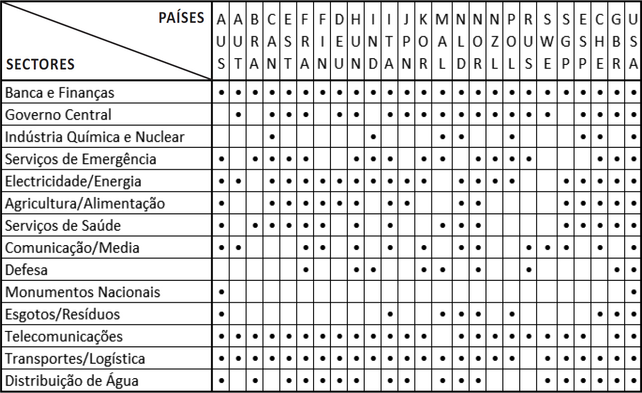 A Tabela 1 resume os resultados de um estudo (Brunner & Suter, 2008) sobre quais os sectores considerados como críticos em diversos países. Enquanto alguns são muito rigorosos na definição dos seus sectores críticos, e quais os bens e serviços por eles fornecidos, outros não têm uma lista oficial de sectores considerados críticos (KRITIS, 2004).