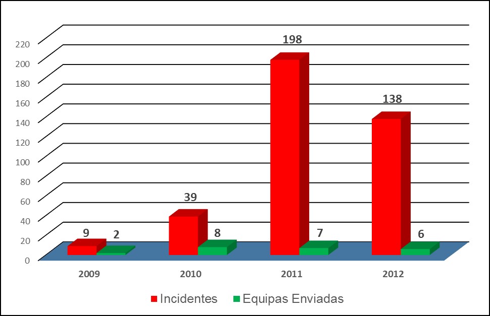 É importante referir que estes são apenas os incidentes reportados e que muitas organizações optam por nunca dar conhecimento externo daquilo que ocorre nas suas instalações. Além disso, o número extremamente baixo de equipas enviadas ilustra o facto de muitas organizações privadas não solicitarem ajuda para lidar com estes eventos (ICS-CERT, 2013a).
