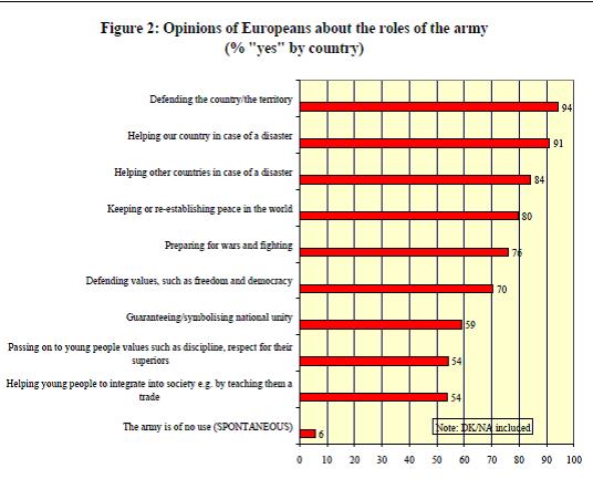 De acordo com estudos recentes de sociologia militar a ligação das forças armadas à nação é influenciada por dois fatores principais: o sentimento de identidade nacional (patriotismo) e a perceção das ameaças. O quadro seguinte, baseado na mesma sondagem, mostra­‑nos como os europeus sentem a função da sua força armada. Das quinze nações europeias consultadas, 94% das suas populações consideram que a sua missão primária é a defesa do território, seguida da missão de auxiliar em desastres nacionais (91%), colaborar em missões humanitárias (84%), auxiliar a manter a paz global (80%), defender valores tais como a liberdade e a democracia (70%), ou garantir a identidade nacional (59%).