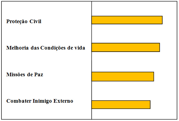 Recorrendo ao estudo já mencionado e publicado pelo IDN, a opinião dos portugueses entrevistados sobre as missões a cometer às Forças Armadas nacionais, mostra o seguinte resultado: