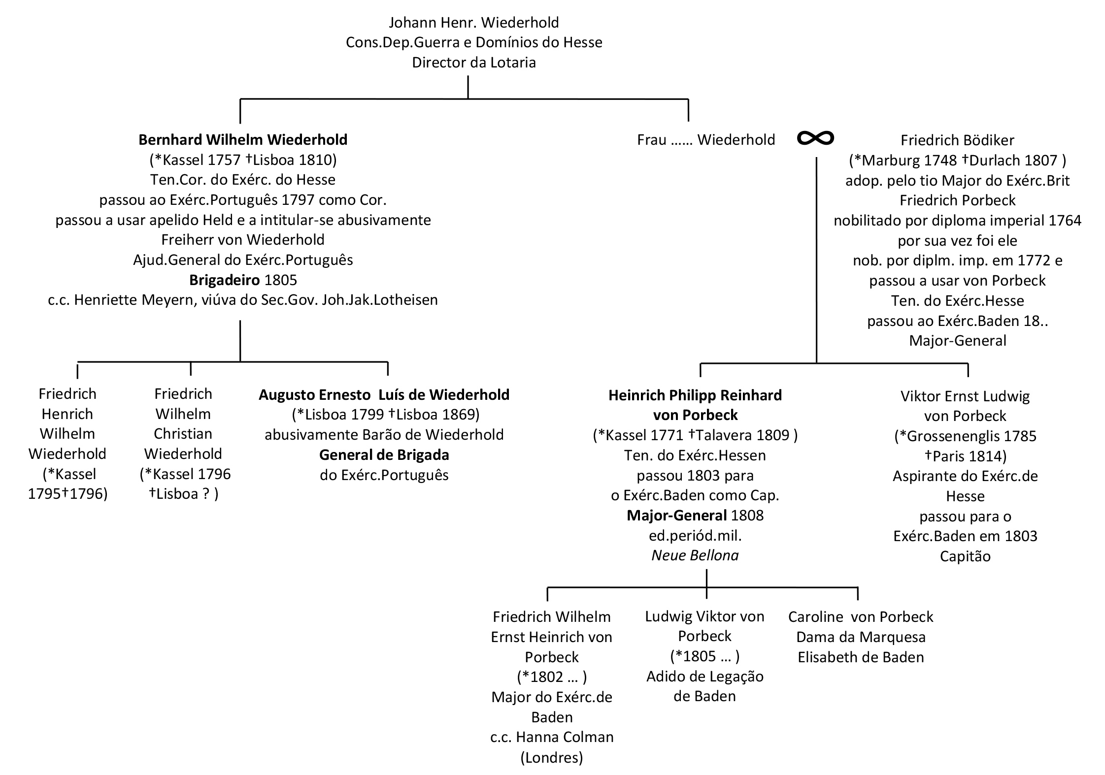 Por outro lado, com o aparecimento na Revolução Francesa dos ‘exércitos nacionais’, a figura do militar profissional, que oferecia os seus serviços aos vários exércitos sem grande preocupação de fidelidade ao seu estado de origem, irá gradualmente desaparecendo. Wiederhold passara-se do Hessen para Portugal, mas a mudança dos seus parentes Porbeck ainda fora mais contrastante: do Hessen tinham-se passado para o exército do vizinho Baden e, como este Grão Ducado entrara para a Confederação do Reno, em 1806, passaram a combater como aliados de Napoleão. O Major-General Heinrich von Porbeck veio, em 1808, comandar o destacamento de Baden das tropas napoleónicas na Península Ibérica. Por essa altura, já seu tio Bernhard estava ao serviço do Exército Português há mais de dez anos, e desenvolvera suficiente dedicação ao país para não querer participar na Legião Portuguesa, o que o colocava do lado oposto aos seus parentes Porbeck, muito especialmente a este seu sobrinho, ao qual ligava especial amizade e estreita colaboração quanto à iniciativa editorial dele na Neue Bellona. O facto de, a partir da chegada dos ingleses, a posição conflitual do exército em que servia ser irrevogavelmente anti-napoleónica, poderia levar Wiederhold a uma confrontação directa com esse seu sobrinho no campo de batalha, e isso só não aconteceu por Wellington ter considerado que o Exército Português ainda não estava preparado para participar na campanha de Talavera. Foi na batalha de 28 de Julho de 1809, ao comandar as suas tropas numa carga de baioneta contra a Brigada das Guardas inglesa, que o General von Porbeck foi atingido em cheio por um tiro de metralha[70], tendo caído morto do seu cavalo. Seu tio e mentor, Bernhard de Wiederhold, morria pouco mais de um ano depois em Lisboa, mas de doença.