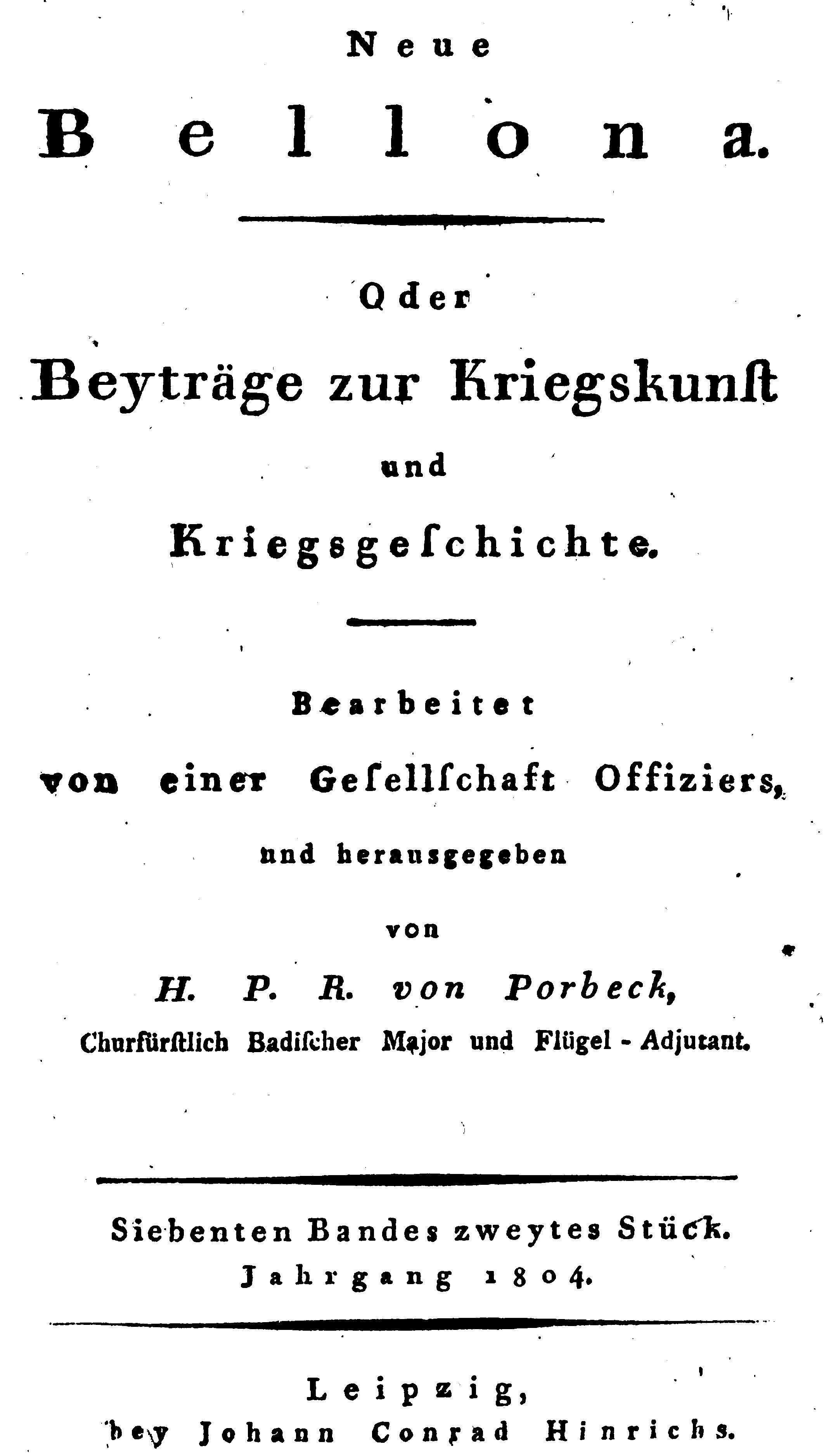 Isto tudo porque se tratava de um oficial de reconhecido merecimento, que pertencia àquele grupo de militares alemães – de cujo escol saiu Clausewitz – que se interessavam tanto pela sua profissão, que eram levados a uma actividade constante de publicação de artigos sobre aspectos variados da mesma – técnicos e políticos. Começou por publicar no Neues Militairisches Journal, periódico que tinha sido fundado em Hanover pelo Aspirante Scharnhorst, em 1788, e que este editou com regularidade anual (fora o período em que comandou uma bateria a cavalo na frente da Flandres, durante as Guerras da Revolução), tendo atingido 13 volumes até 1805[64]. Dado que os autores dos artigos não estão identificados, não se sabe quais atribuir a Heinrich von Porbeck; em 1801, Scharnhorst passara ao serviço da Prússia como Tenente Coronel de Artilharia, mas em funções de especial responsabilidade, que o terão impedido de prosseguir na edição do periódico, e será talvez por isso que von Porbeck, por encargo de um grupo de camaradas seus do Hessen, reiniciou, nesse ano, a publicação de outro periódico militar Neue Bellona[65].