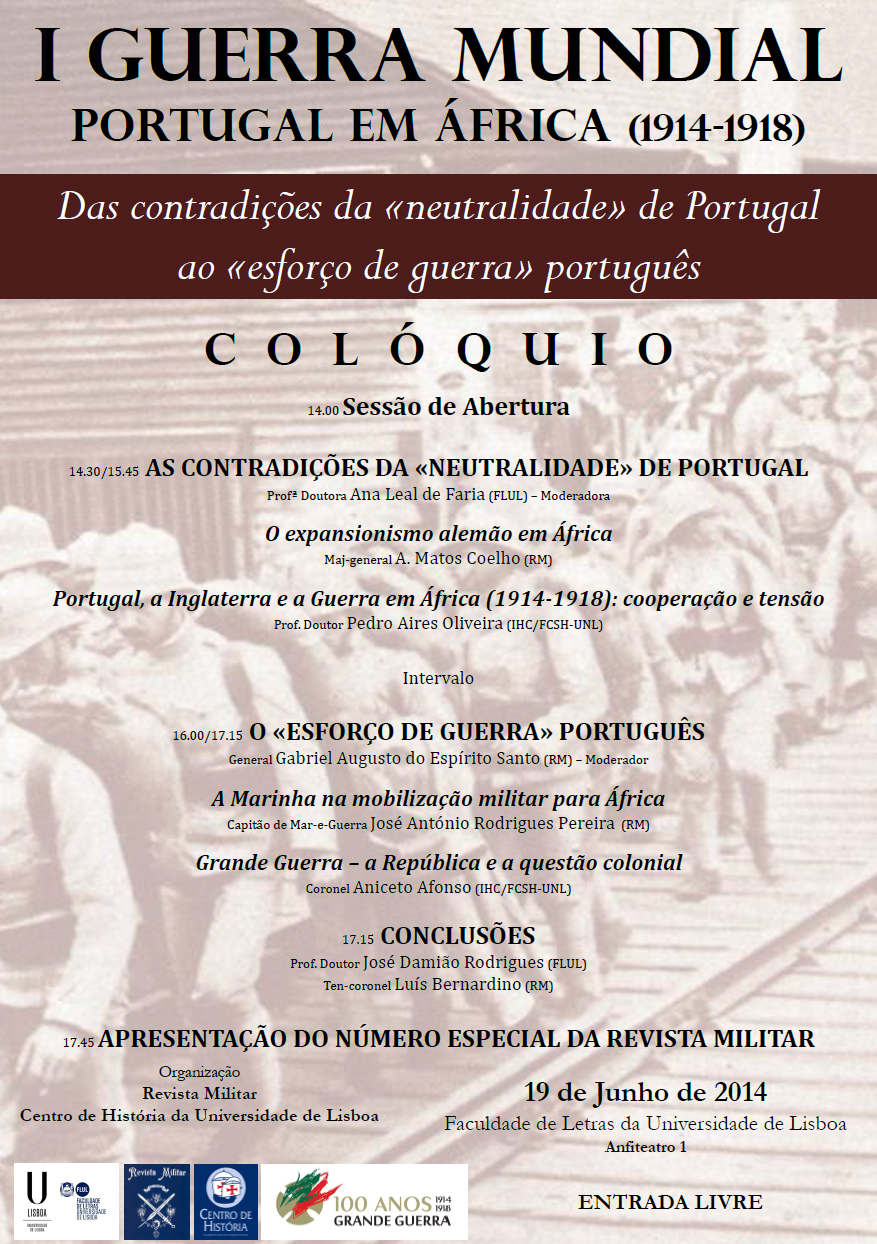 Em boa hora a Revista Militar decidiu realizar o Colóquio “I Guerra Mundial – Portugal em África (1914-1918). Das contradições da «neutralidade» de Portugal ao «esforço de guerra» português”, integrando, numa sessão realizada no passado dia 19 de junho de 2014, na Faculdade de Letras da Universidade de Lisboa, um conjunto de especialistas que convergiram, quase que instintivamente, ao analisarem a beligerância portuguesa no espaço continental africano ultramarino, numa homenagem a todos quantos combateram na I Grande Guerra, e especialmente aqueles que perderam a sua vida nos teatros africanos na defesa da Pátria neste período da nossa história.